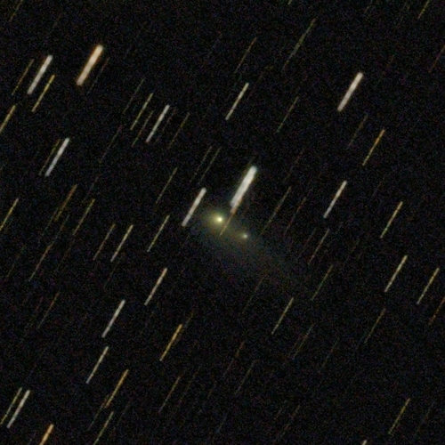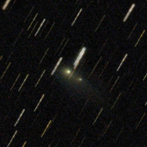 Komet 240P/NEAT am 15.12.2025, f = 600 mm, QHY294C, IRB-Filter, 20:00 UT, 01:58 Stunden Belichtungszeit, 50%, 70% und 100% der Originalauflösung. Dieses Objekt ist ein recht ungewöhnlicher "Doppelkomet", dessen ursprünglicher Kern sich in zwei Fragmente aufgespalten hat. Beide Fragmente besitzen eine in östlicher Richtung (nach links) elongierte Coma, und die beiden Comae scheinen miteinander verbunden zu sein. Dieses "Halo" um die beiden Fragmente zeigt eine lichtschwache Fortsetzung in südwestlicher Richtung. Beide Comae erscheinen gelblich, was auf eine dominante Staubkomponente hinweist.
