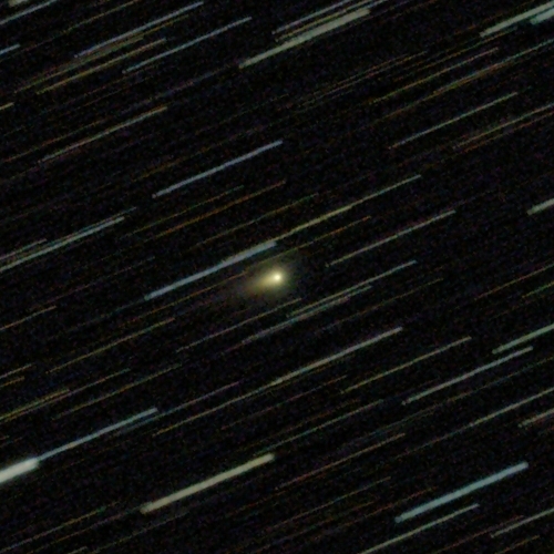Interstellarer Komet 3I/ATLAS am 25.12.2025, f = 300 mm, QHY294C, IRB-Filter, 04:30 UT, 02:54 Stunden Belichtungszeit, 70% und 100% der Originalauflösung. Der Komet zeigt weiterhin einen kurzen Schweif, und die gelbliche Farbe deutet darauf hin, dass sowohl die Coma als auch der Schweif von Staub dominiert werden. Interessanterweise scheint es so, als ob der Schweif zur Sonne zeigen würde, also nach Südosten (unten links). Dies ist wahrscheinlich ein Projektionseffekt, da sich die Erde zur Zeit zwischen der Sonne und dem Kometen befindet, so dass ein irdischer Beobachter den Schweif "von vorne" sieht, da er in Wirklichkeit von der Sonne und der Erde weg zeigt. Unter dieser Beobachtungsgeometrie würde bereits eine leichte Krümmung des Schweifs den optischen Eindruck erwecken, als zeige er zur Sonne und die Coma sei in die gleiche Richtung elongiert.