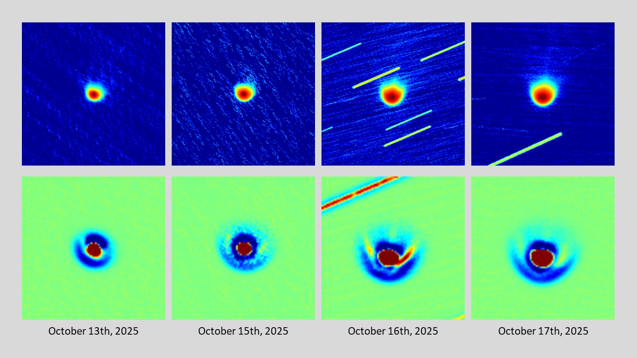 Komet C/2025 A6 (Lemmon) am 13.-17.10.2025, f = 600 mm, DZK 33UX250, 570-nm-Orange-Kantenfilter. Die Bilder wurde jeweils zwischen ca. 03:00 und 04:00 UT unmittelbar vor der Morgendämmerung auf dem Ballon d'Alsace unter hervorragenden Wetterbedingungen aufgenommen. Die obere Reihe zeigt jeweils das Intensitätsbild in identischer logarithmischer Skalierung, die untere Reihe die vergrößerte und hochpassgefilterte Variante. Deutlich sind dabei Staub-Jets zu erkennen, die orthogonal zur Richtung zur Sonne aus dem inneren Bereich der Coma austreten. Die untere Zusammenstellung zeigt den Kometen im Zeitraum 28.09.-16.10.2025 in einheitlichem Maßstab und illustriert so zeitliche Veränderungen der Größe der Staubcoma.