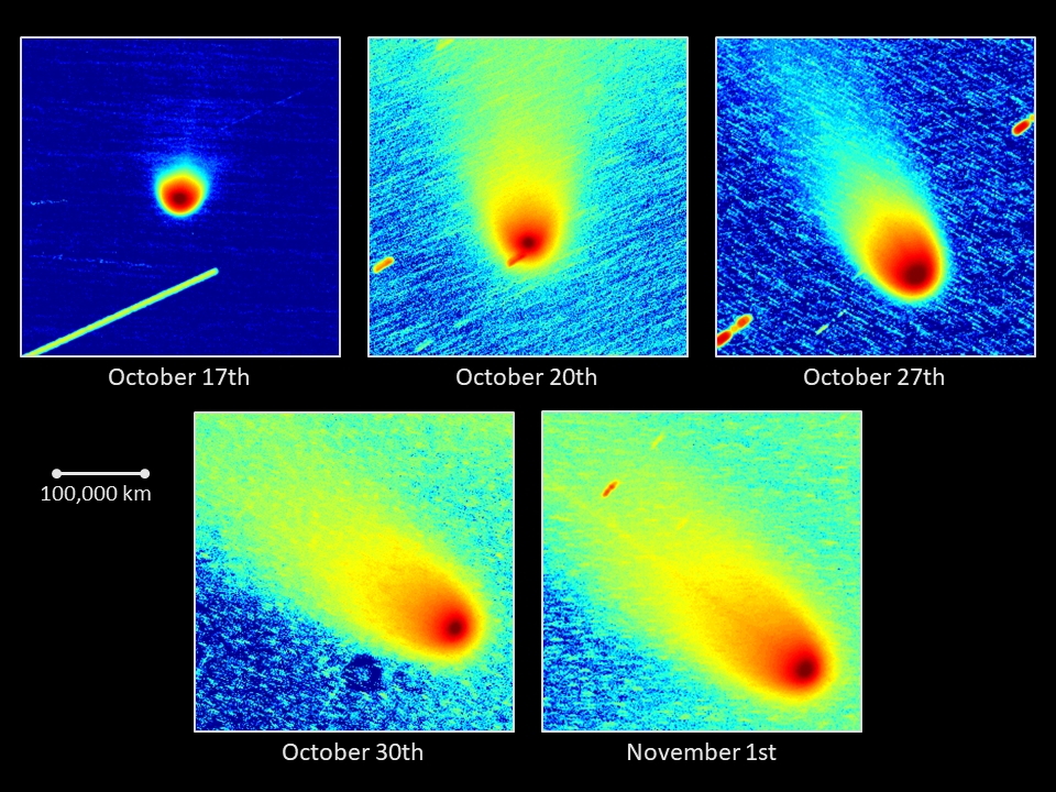 Komet C/2025 A6 (Lemmon) am 01.11.2025, f = 600 mm, DZK 33UX250, 570-nm-Orange-Kantenfilter, ca. 18:00 UT, 5:36 Minuten Belichtungszeit, im Vergleich zu den seit dem 17.10.2025 erstellten Aufnahmen. In der Zusammenstellung unten sind die Aufnahmeparameter der Kamera, die logarithmische Skalierung der Intensität und der Abbildungsmaßstab für alle Bilder identisch. Nach einer bis zum 17.10.2025 andauernden "Ruhephase" kam es im Zeitraum 17.-20.10.2025 zu einer schnellen Vergrößerung der Staubcoma und einer Aufhellung des Staubschweifs. In der darauffolgenden Woche (bis zum 27.10.2025) wurde der Schweif schwächer, die Staubcoma vergrößerte sich jedoch weiter. Einige Tage später (30.10.-01.11.2025) wurde der Staubschweif wieder heller, und die Staubcoma dehnte sich kontinuierlich aus. Diese Intensivierung der Staubkomponente ist wahrscheinlich auf die Annäherung des Kometen an die Sonne zurückzuführen, die zu einer Erwärmung der Oberfläche seines Kerns, zur Sublimation von Eis unter der Oberfläche und zur Freisetzung von Staubpartikeln aus dem Kern in die Coma und den Schweif führt. Die Entfernung des Kometen von der Sonne verringerte sich im Zeitraum 17.10.-01.11.2025 von 0.74 auf 0.56 AE, und das Perihel mit 0.53 AE Sonnenabstand wird am 08.11.2025 erreicht (JPL Horizons Ephemeris).
