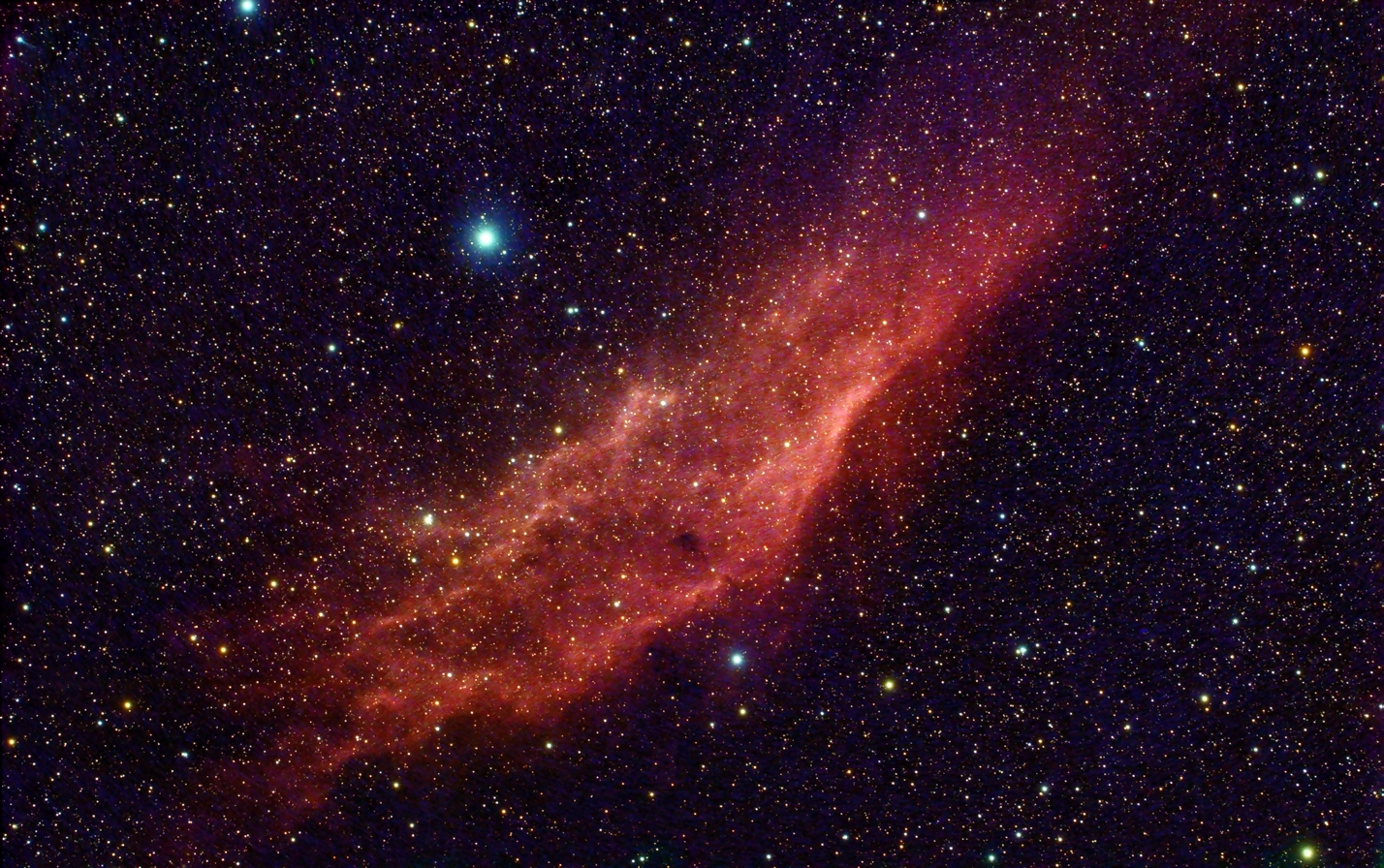 HII-Emissionsregion NGC1499 ("California Nebula") (Per) auf Basis einer RGB-Aufnahme vom 27.12.2025 und Hα+[OIII]-Bilddaten vom 25./29.12.2025, f = 300 mm, QHY294C, IRB-Filter und Hα+[OIII]-Filter, 12:19 Stunden Gesamt-Belichtungszeit, skaliert auf 35% und 50% der Originalauflösung.