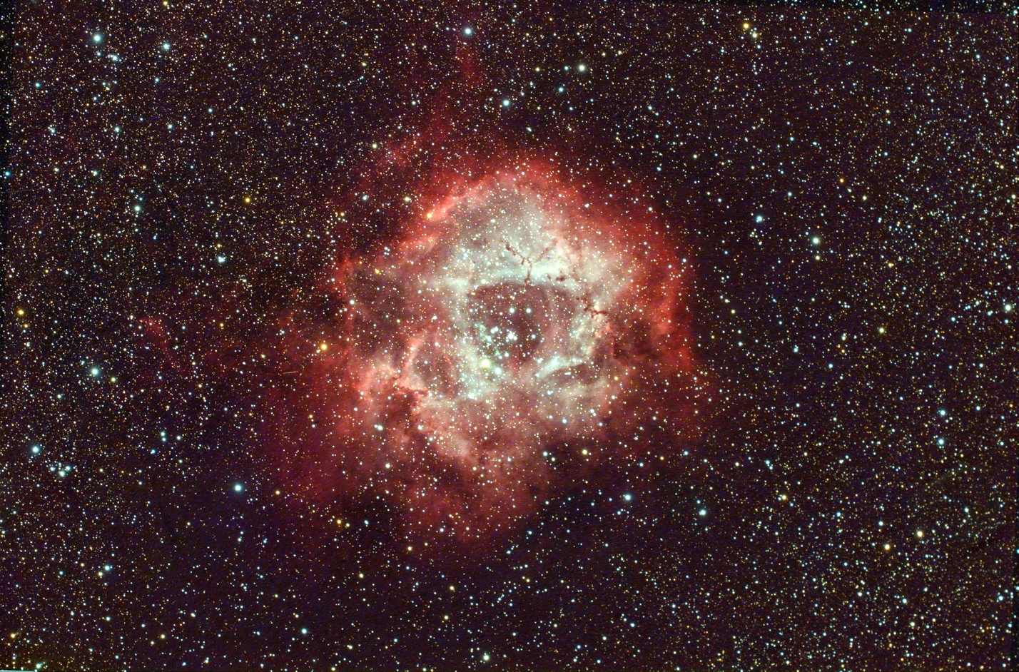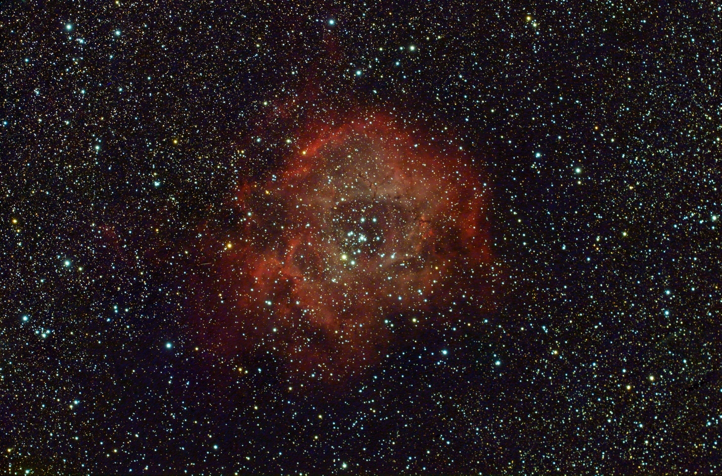 HII-Emissionsregion NGC2239 (Mon) auf Basis der RGB-Bilddaten vom 24.12.2025 und einer Hα+[OIII]-Aufnahme vom 26.12.2025, f = 300 mm, QHY294C, IRB-Filter und Hα+[OIII]-Filter, 09:16 Stunden Gesamt-Belichtungszeit, skaliert auf 35% der Originalauflösung (große Bilder skaliert auf 50%, 70% und 100% der Originalauflösung). Der Nebel ist mit einem offenen Sternhaufen in der Nähe seines Zentrums assoziiert. Bei den kleinen Dunkelwolken-"Fetzen" im nördlichen (oberen) Bereich des Nebels handelt es sich um Bok-Globulen, in denen neue Sterne entstehen.