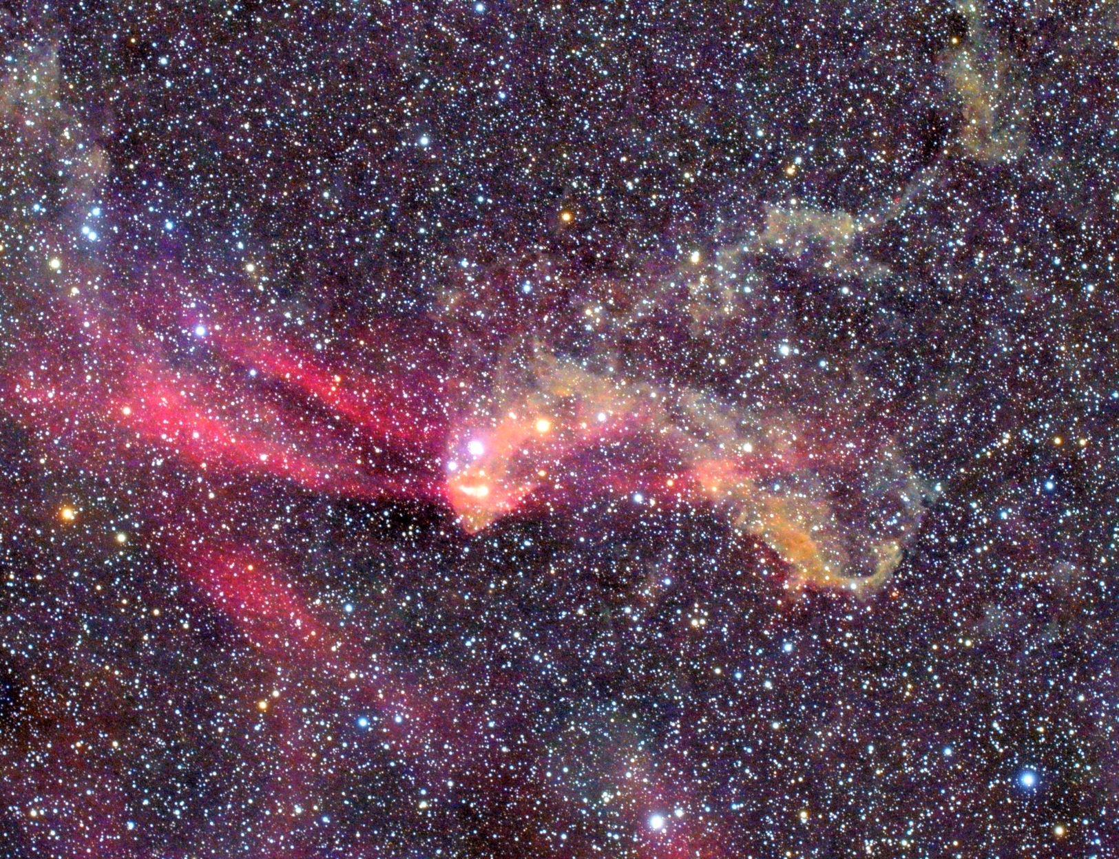 Region um γ Cyg (Sadr) (Cyg) am 17.06.2025, f = 135 mm, QHY294C, mit Hα+[OIII]-Filter, RGG-Bild, R-Kanal (Hα), G-Kanal ([OIII]), skaliert auf 35% der Originalauflösung (große Bilder skaliert auf 50% und 70% der Originalauflösung). Östlich (links) von γ Cyg befindet sich die HII-Emissionsregion IC1318B/C, auch "Schmetterlingsnebel" genannt, nord-nordöstlich der offene Sternhaufen NGC6910, süd-südwestlich der offene Sternhaufen M29, am nördlichen Bildrand der Bereich um den Reflexionsnebel NGC6914, in der nordwestlichen Bildecke die HII-Region IC1318A, am westlichen Bildrand die Dunkelwolke LDN877 und in der südwestlichen Bildecke der Wolf-Rayet-Nebel NGC6888.