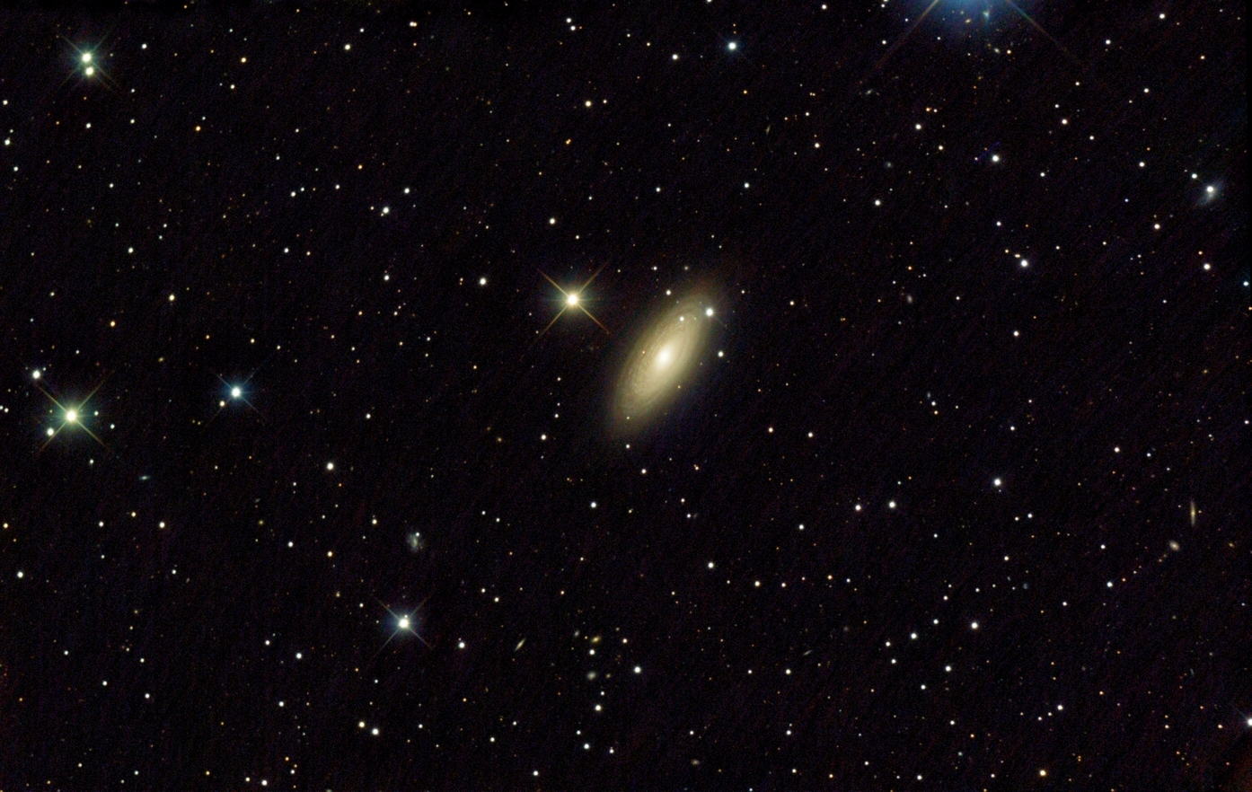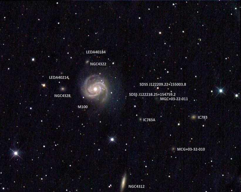 Balkenspiralgalaxie M100 (Com) mit umgebenden lichtschwachen Galaxien am 22.03.2026, f = 1200 mm, QHY294C, IRB-Filter, skaliert auf 35% und 50% der Originalauflösung (große Bilder skaliert auf 50% und 70% der Originalauflösung).