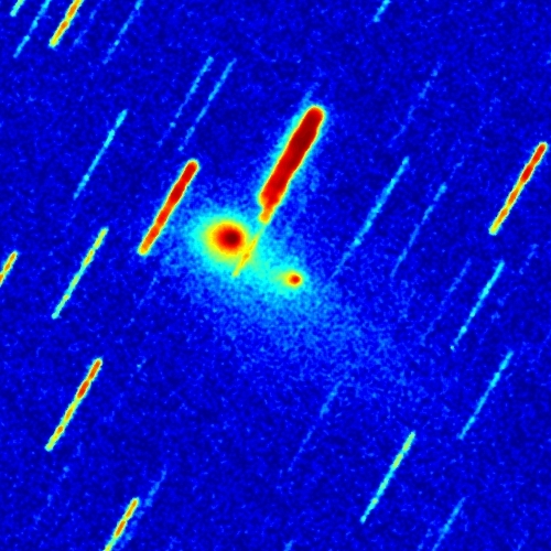Komet 240P/NEAT am 15.12.2025, f = 600 mm, QHY294C, IRB-Filter, 20:00 UT, 01:58 Stunden Belichtungszeit, 50%, 70% und 100% der Originalauflösung. Dieses Objekt ist ein recht ungewöhnlicher "Doppelkomet", dessen ursprünglicher Kern sich in zwei Fragmente aufgespalten hat. Beide Fragmente besitzen eine in östlicher Richtung (nach links) elongierte Coma, und die beiden Comae scheinen miteinander verbunden zu sein. Dieses "Halo" um die beiden Fragmente zeigt eine lichtschwache Fortsetzung in südwestlicher Richtung. Beide Comae erscheinen gelblich, was auf eine dominante Staubkomponente hinweist.