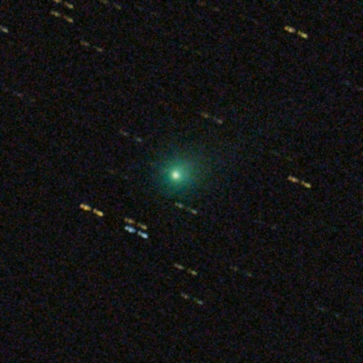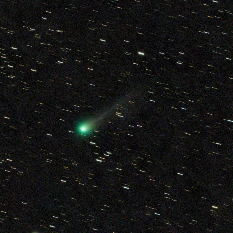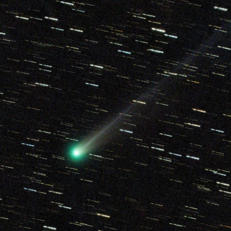 Komet C/2025 A6 (Lemmon) am 02.10.2025, f = 300 mm, QHY294C, IRB-Filter, 43:30 Minuten Belichtungszeit, 50% der Originalauflösung. Das Bild wurde um ca. 04:00 UT unmittelbar vor der Morgendämmerung bei durchziehenden dünnen Wolken aufgenommen. Die intensive grüne C2-Emission der Coma ist weiterhin dominant, ebenso wie der schmale gerade Gasschweif. Mittlerweile ist jedoch auch ein weiter aufgefächerter Staubschweif sichtbar, der nicht genau parallel zum Gasschweif verläuft.