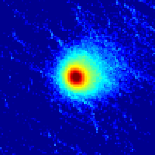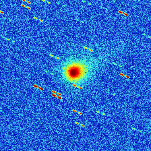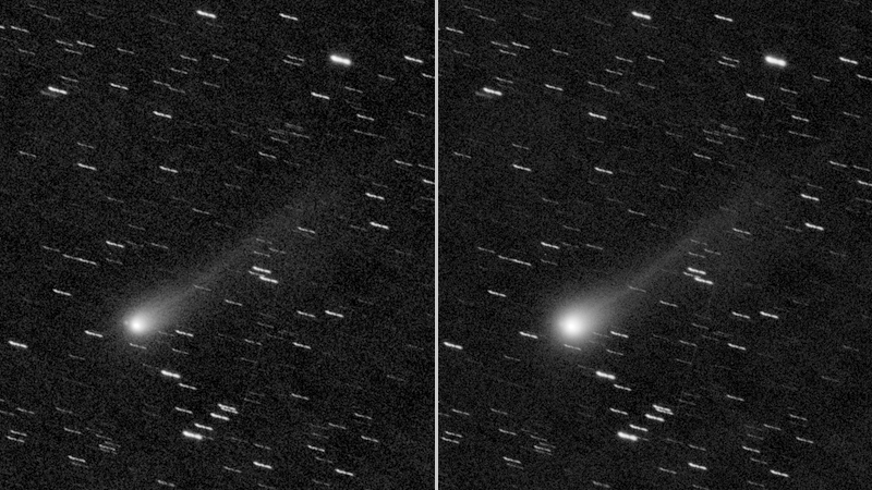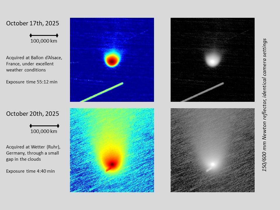 Komet C/2025 A6 (Lemmon) am 20.10.2025, f = 600 mm, DZK 33UX250, 570-nm-Orange-Kantenfilter, ca. 18:00 UT, 4:40 Minuten Belichtungszeit, im Vergleich zur Aufnahme vom 17.10.2025. Die Intensitäten sind in identischer logarithmischer Skalierung wiedergegeben. Während des zeitlichen Abstands von 87 Stunden zwischen den beiden Bildern hat sich der Durchmesser der Coma offenbar um mindestens 80% vergrößert, was wohl eher noch eine Untergrenze darstellt, da das zweite Bild unter viel ungünstigeren Beobachtungsbedingungen und mit einer um einen Faktor 12 kürzeren Belichtungszeit als das erste aufgenommen wurde. Auch der Staubschweif ist deutlich heller und breiter geworden (das Orange-Filter blockiert die grünen und blauen Gas-Emissionen, so dass diese auf den Bildern nicht sichtbar sind). Der Abstand zwischen Komet und Sonne nimmt kontinuierlich ab und beträgt mittlerweile weniger als 0.7 AE (JPL Horizons Ephemeris). Infolgedessen könnten Eisablagerungen unter der Oberfläche des Kometenkerns durch die zunehmende Sonneneinstrahlung erhitzt worden sein, was zu ihrer schnellen Sublimation und einer anschließenden massiven Freisetzung von Staubpartikeln in die Coma und den Schweif geführt haben würde.