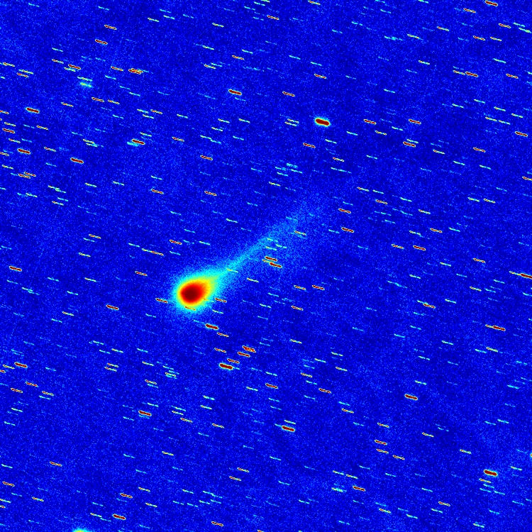 Komet C/2025 A6 (Lemmon) am 20.09.2025, f = 600 mm, QHY294C, IRB-Filter, 28:30 Minuten Belichtungszeit, 70% der Originalauflösung. Das Bild wurde um ca. 02:00 UT vor der Morgendämmerung durch eine Schicht aus mehr oder weniger dünnen Cirrus-Wolken aufgenommen. Die Farbversion zeigt, dass die Coma im grünen Licht der C2-Emission leuchtet. Außerdem ist die Coma in Richtung Nordwesten (oben rechts) leicht elongiert. Das invertierte und kontrastverstärkte Grauwertbild und das Falschfarbenbild zeigen andeutungsweise einen kurzen geraden Schweif, der ebenfalls in diese Richtung zeigt.
