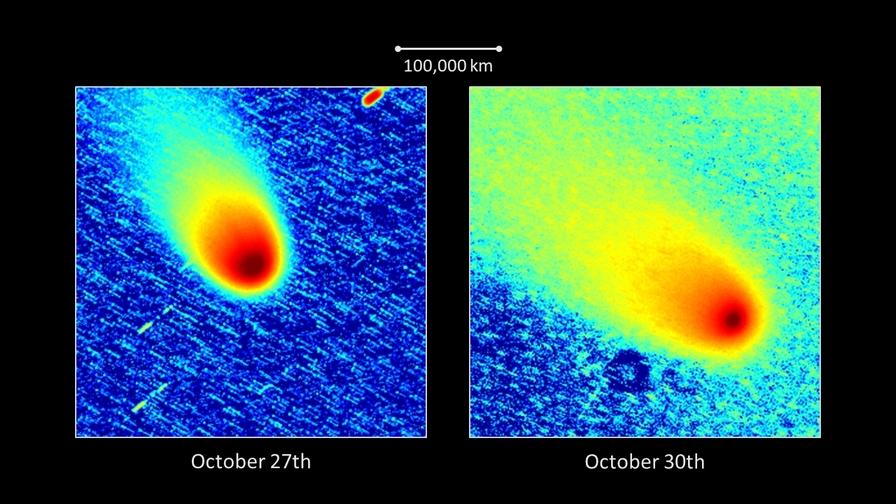 Komet C/2025 A6 (Lemmon) am 30.10.2025, f = 600 mm, DZK 33UX250, 570-nm-Orange-Kantenfilter, ca. 18:00 UT, 9:56 Minuten Belichtungszeit, im Vergleich zur Aufnahme vom 27.10.2025. Beide Bilder wurden auf einen einheitlichen Maßstab skaliert. Die Intensitäten sind in identischer logarithmischer Skalierung in Falschfarben wiedergegeben. Obwohl die Aufnahme vom 30.10.2025 durch dünne Cirruswolken beeinträchtigt wurde, erscheint der Staubschweif deutlich ausgeprägter als noch drei Tage zuvor. Offenbar kam es ähnlich wie am 17./20.10.2025 in den 72 Stunden zwischen den Aufnahmezeitpunkten der Bilder zu einer Freisetzung von großen Mengen an Staub.