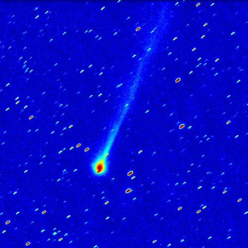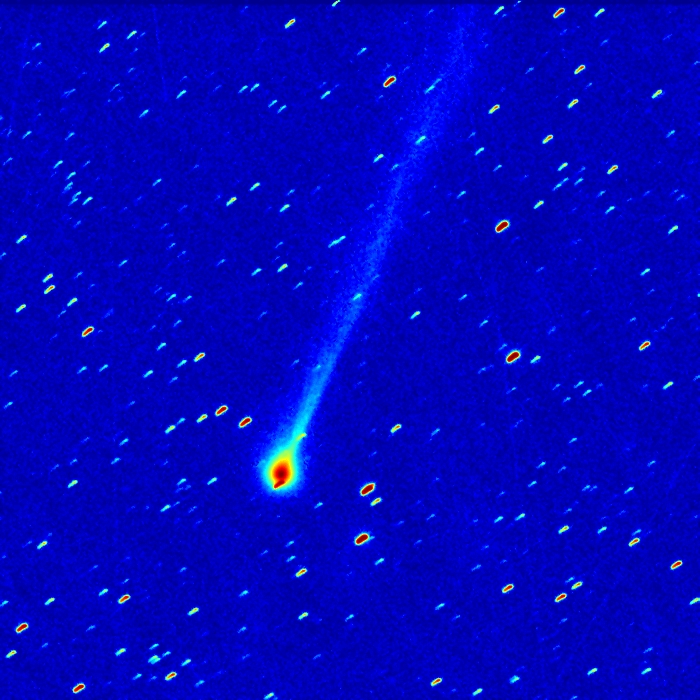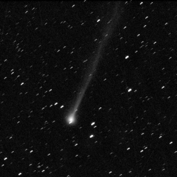Komet C/2025R3 (PanSTARRS) am 02.04.2026, f = 600 mm, QHY1253P, SLOAN-r-Filter, 03:30 UT, 39:15 Minuten Belichtungszeit, 50% und 70% der Originalauflösung.